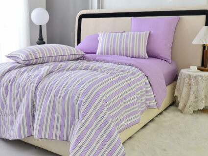 В комплект входит легкое, мягкое, летнее одеяло. Его можно стирать вместе с другим бельем, оно быстро сохнет и после стирки его не нужно гладить.