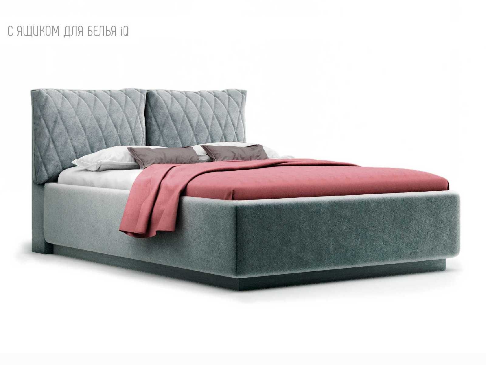 Кровать укомплектована IQ с подъемным механизмом и ящиком для белья без дна (дополнительная платная опция - дно к ящику IQ из HDF (ХДФ). Каркас кровати на цоколе, декоративный чехол на цоколе съёмный. Глубина ящика для белья - 30 см, без ограничения нагрузки на ящик.