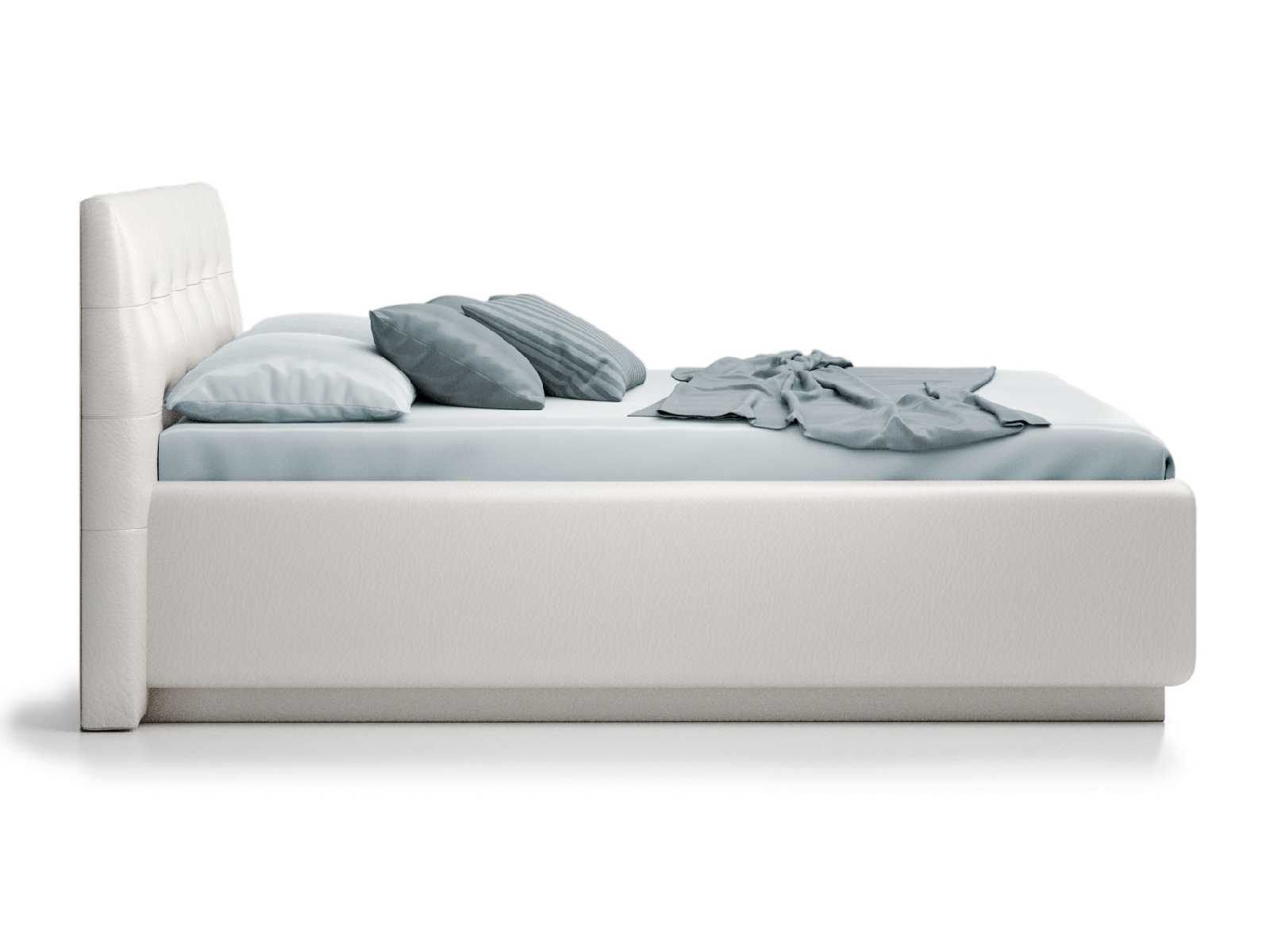 Кровать укомплектована IQ с подъемным механизмом и ящиком для белья без дна (дополнительная платная опция - дно к ящику IQ из HDF (ХДФ). Каркас кровати на цоколе, декоративный чехол на цоколе съёмный. Глубина ящика для белья - 30 см, без ограничения нагрузки на ящик.