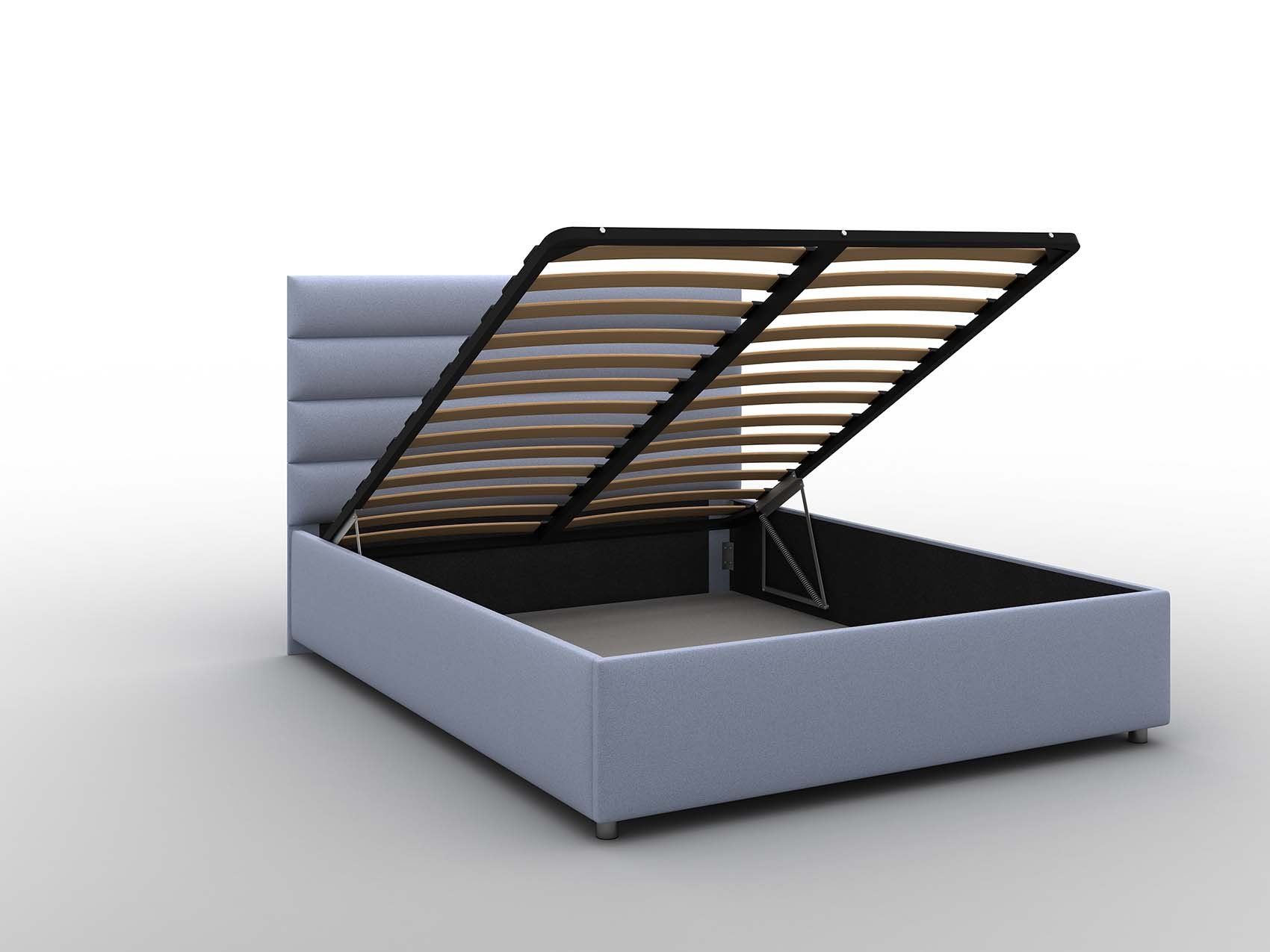 Кровать оснащена подъёмным механизмом. В такой вариации основание поднимается и открывает доступ к ящику для хранения белья и других вещей. Такая система может заменить небольшой шкаф и решить вопрос с организацией пространства.