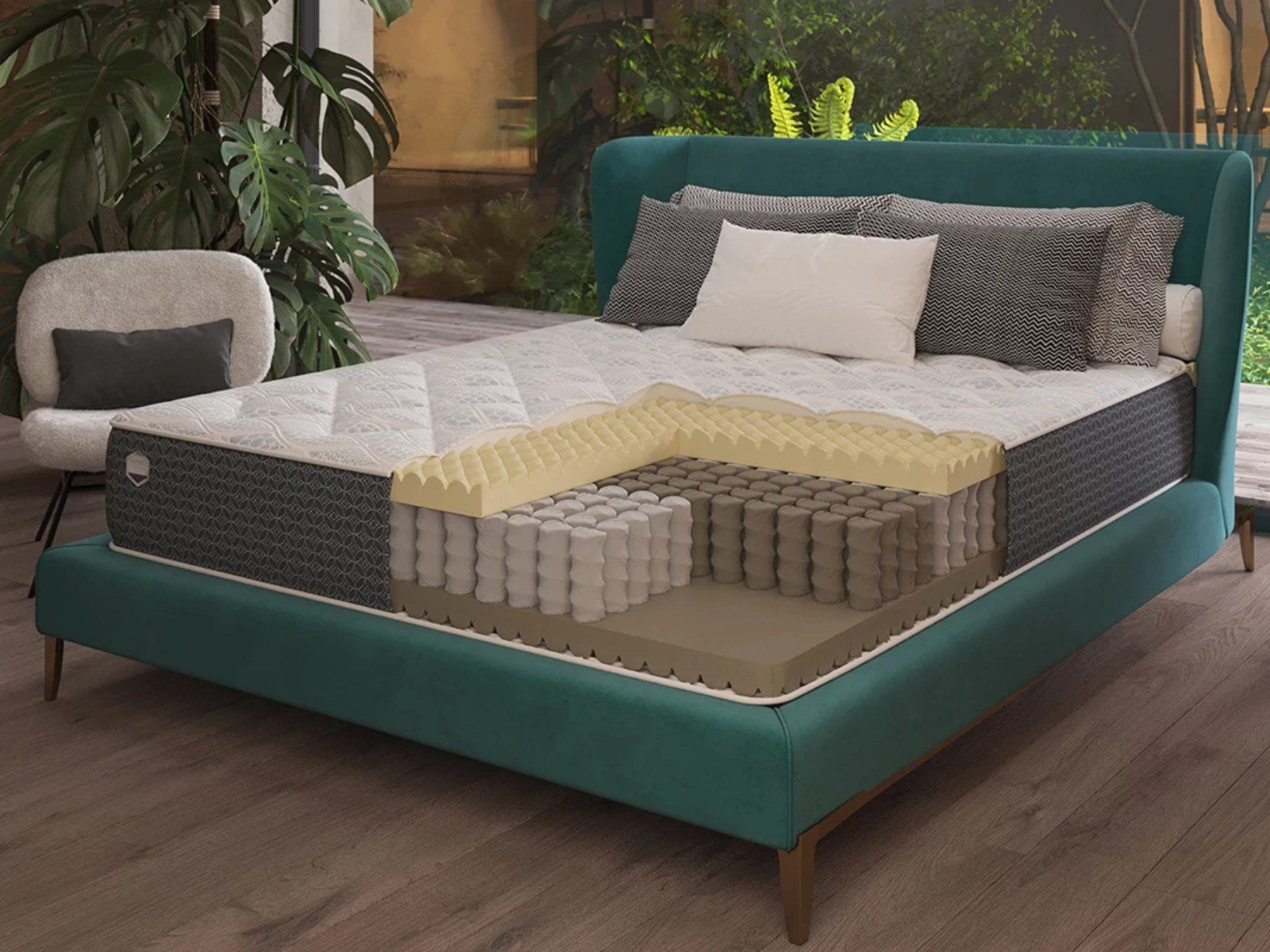 В основе - материалы последнего поколения без свинца и формальдегидов: базовый слой - независимые пружины микропакет (1428 пружин на 1 спальное место) высотой 14 см и анатомический слой с микромассажным эффетом (около 4 см) с каждой стороны. Благодаря микро-шипикам - одна сторона матраса лучше вентилируется и ослабляет давление, оказываемое матрасом на тело. Матрас рекомендован людям с заболеваниями кровообращения, варикозным расширением вен и др.
