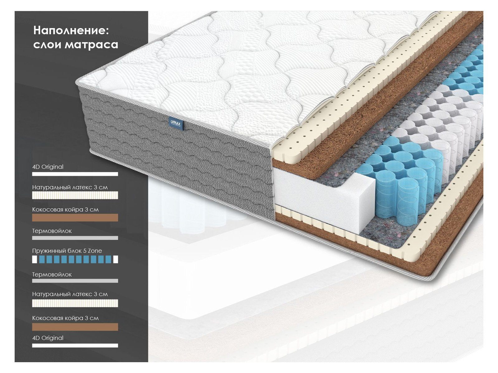 Димакс ОК Ультимейт – это двусторонний пружинный матрас с двумя уровнями жёсткости: средней со стороны латекса и высокой со стороны кокоса. Модель выделяется полностью натуральные наполнением и 5-зональным блоком пружин. В результате спящий получает максимально комфортный сон с точеной ортопедической поддержкой всего тела.
