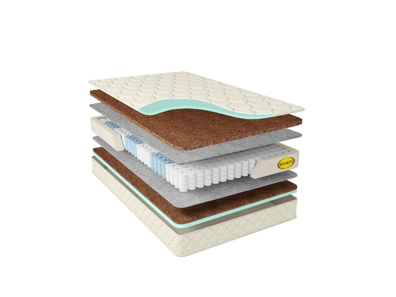 Различные уровни жёсткости достигаются с помощью наполнителя, установленного в различной толщине. С одной стороны проложена 1 см плита кокосовой койры, а с противоположной – 2 см. Этот полностью натуральный наполнитель оказывает великолепную ортопедическую поддержку, а также сохраняет здоровый климат спальной зоны – материал отлично пропускает воздух.