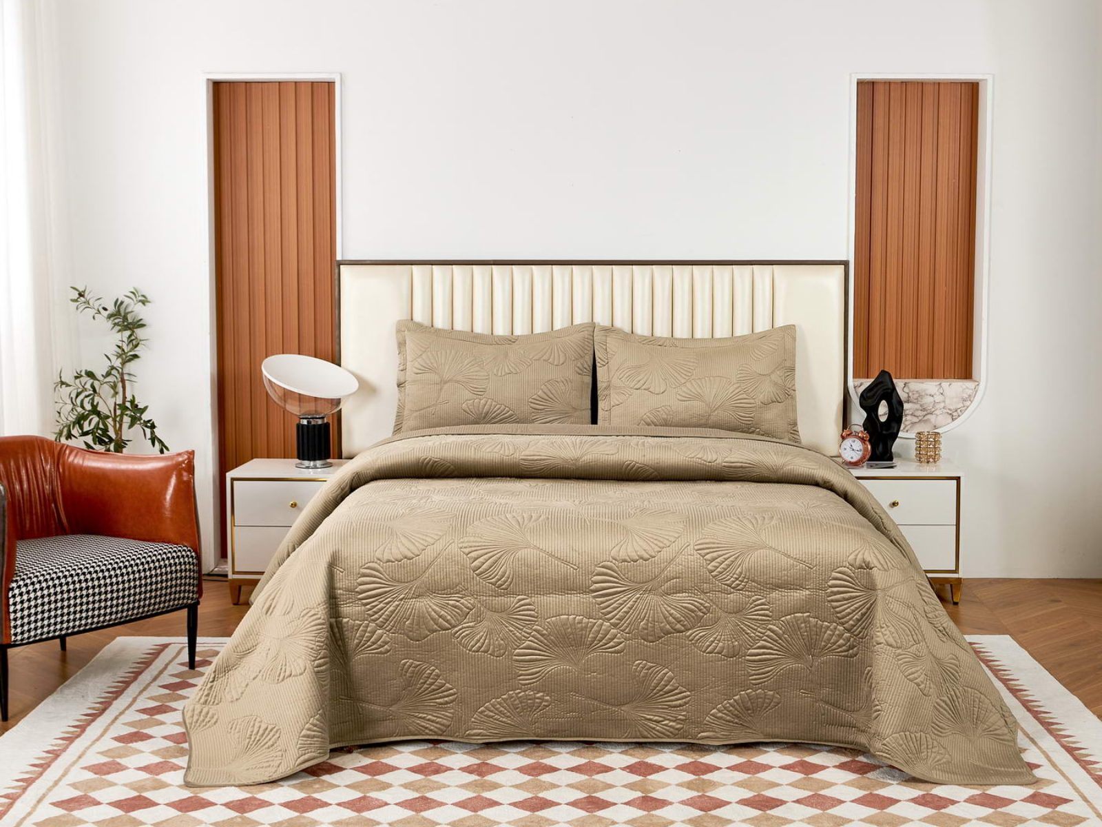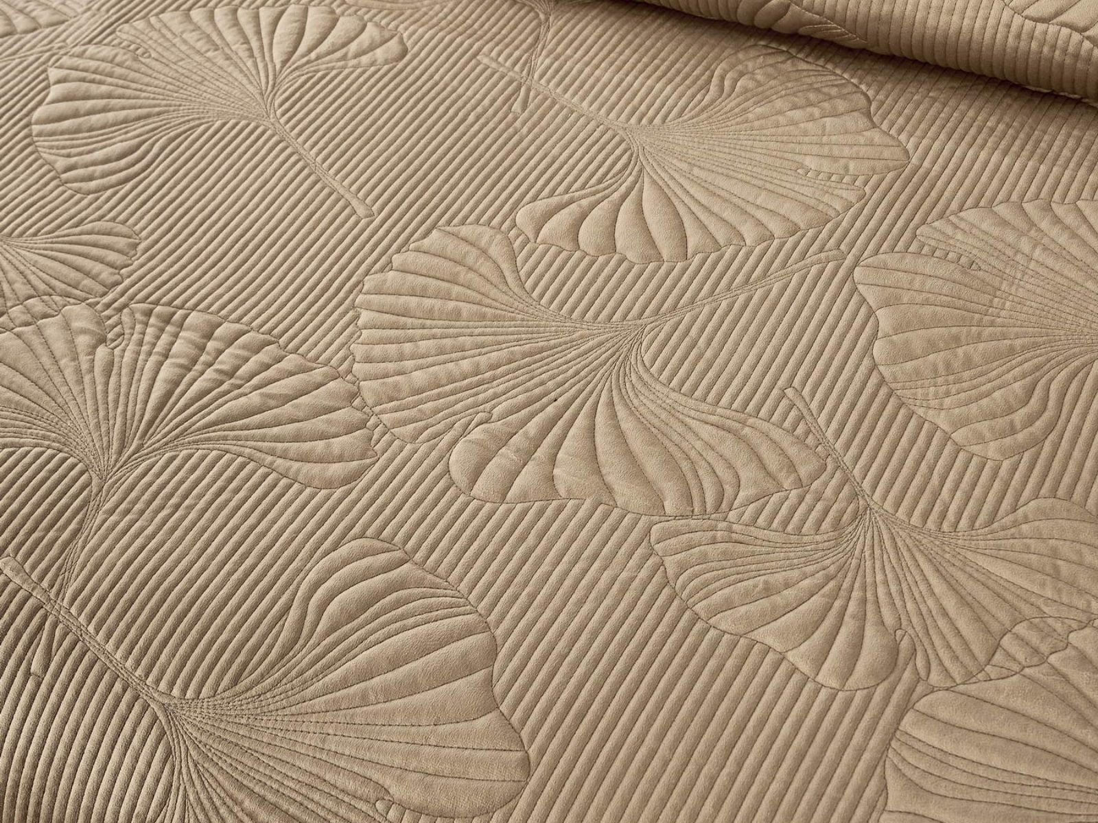 Роскошный растительный орнамент в виде вышивки добавит Вашей спальне элегантности и изысканности. Текстура цветочного узора будет сочетаться с другими элементами интерьера, такими как шторы, подушки, ковры и т.д.