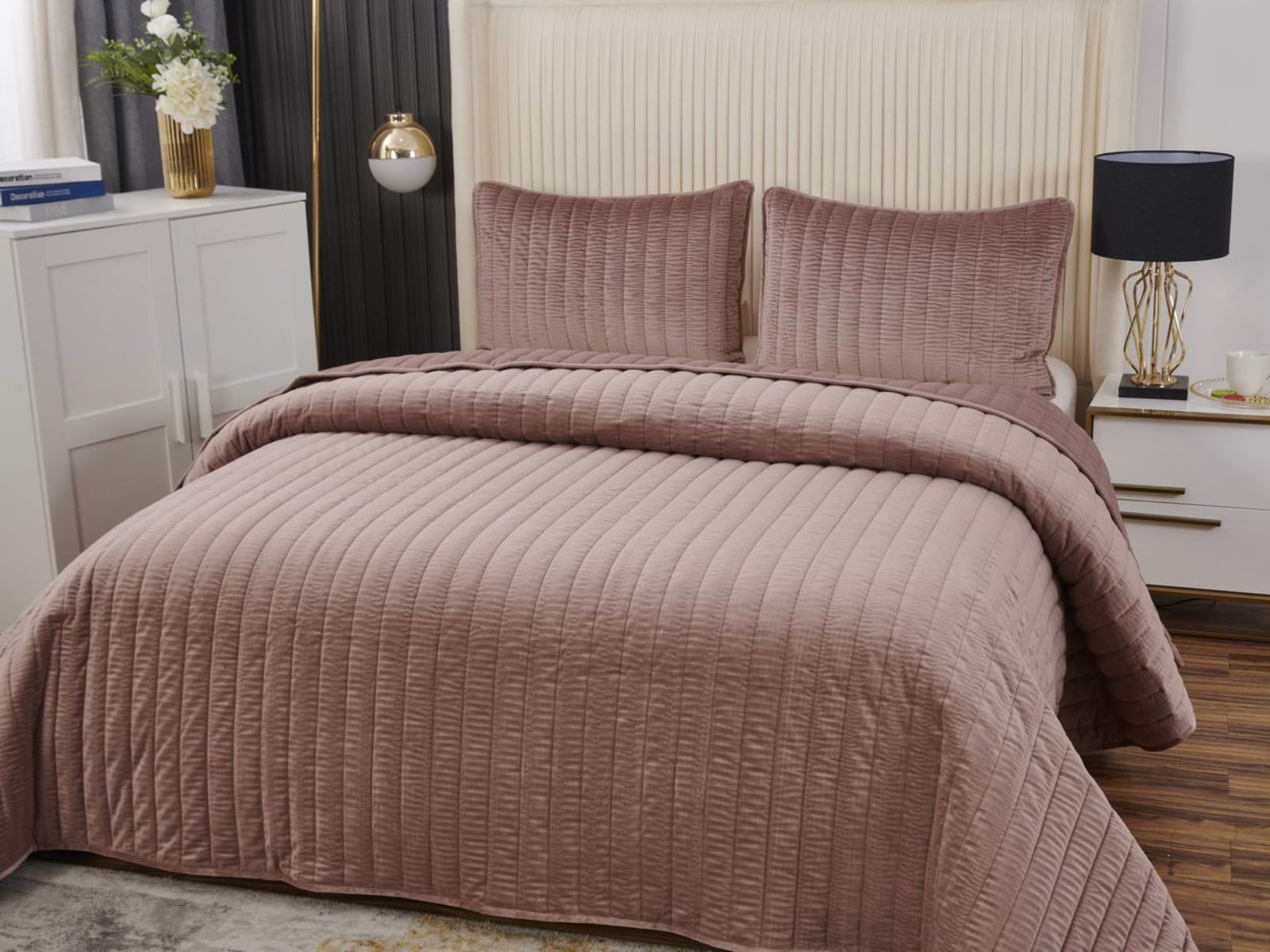 Величественный вид, мягкость материала, королевская роскошь – всё это идеально описывает новое покрывало Фердинанд. Оно выполнено из велюра на основе полиэстера и представлено в оттенках: чайная роза, молоко, бежевый, кофе, стоун, серый и мокко.