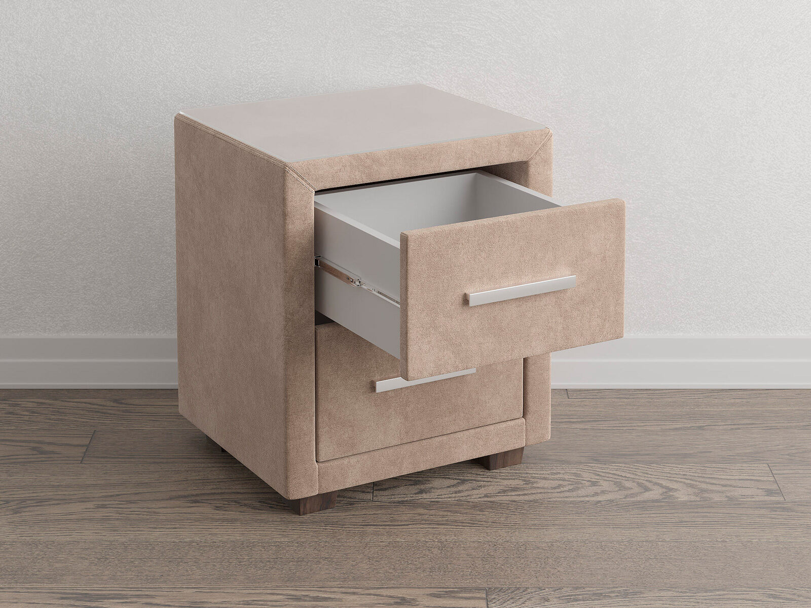 Прикроватная тумба с двумя выдвижными ящиками сочетается с любыми моделями кроватей, органично вписывается в интерьер практически любого стиля. Каркас тумбы выполнен из ДСП. Каркас тумбы и фасад ящиков покрыты обивочным материалом. Для удобства использования и продления срока эксплуатации, рекомендуется использовать стеклянную накладку. Накладка используется в качестве столешницы для тумбы и защищает ее от повреждений и загрязнений. Стеклянная столешница заказывается дополнительно.