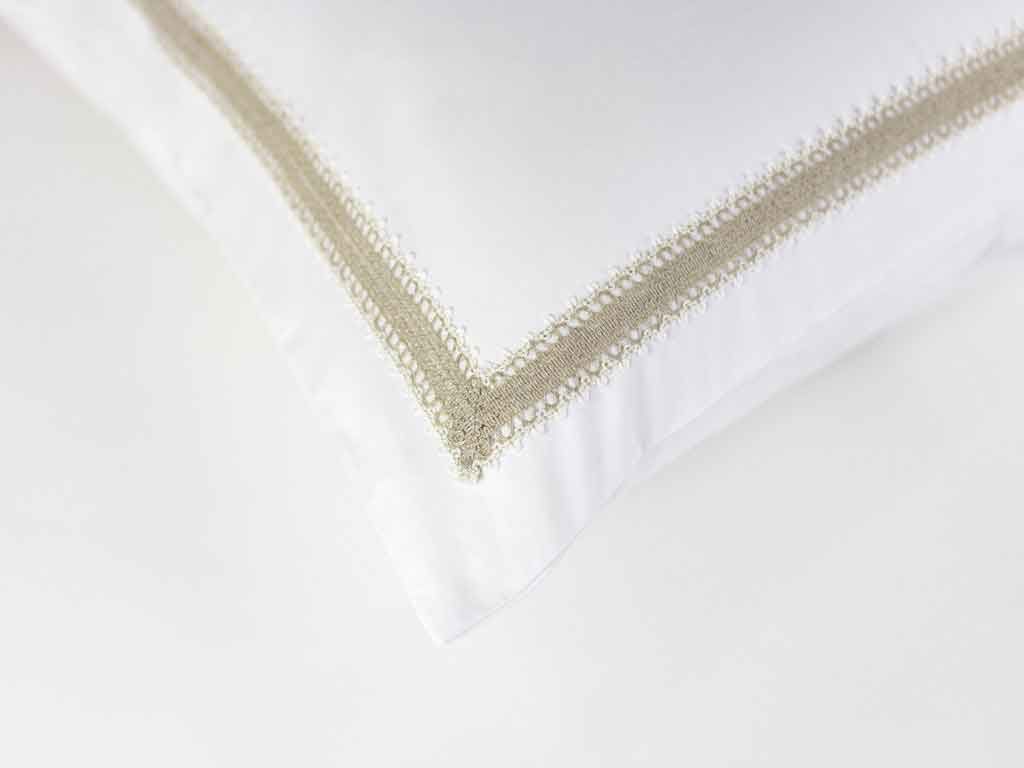 Наволочки классические, отделанные ШИРОКИМ КРУЖЕВОМ (на запахе), пододеяльник на потайной молнии, отделанный ШИРОКИМ КРУЖЕВОМ. Цвет основной ткани: белый; цвет кружева: бежевый.